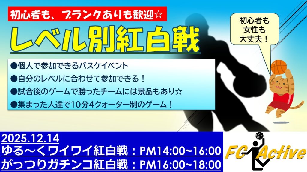 注意:バスケ経験者のみの紅白戦ではありません。ガチンコでやりたい初心者も含みます。